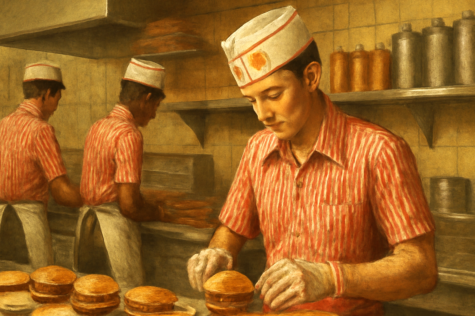Людей подкупала простота: еду не носили в тарелках и на разносах, а заворачивали в бумажные пакеты. Хочешь — ешь на скамейке в парке, хочешь — уплетай на ходу. А цены просто взрывали мозг: сочный бургер и напиток — всего за 15 центов. Для американцев это было как маленькая революция на обеденном перерыве.