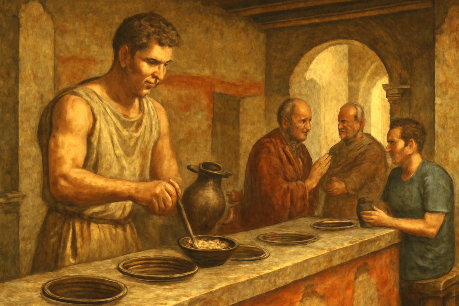 Взять хотя бы Римскую империю: там в термах кормили тысячи людей быстро и одинаково. У прилавков термополиев готовили простые блюда — каши, хлеб с мясом, вино — и подавали их так же шустро, как в современной фастфуд-сети. При этом термополии были удивительно унифицированы: римлянин в Британии мог зайти в местную харчевню и заказать почти то же, что ел бы в Помпеях. Стандарты — во всей красе.
