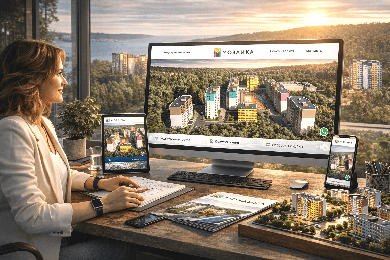 Клиент на главной странице портала МОЗАИКА видит квартал сверху: светлый двор, зеленый периметр, ясную геометрию домов, ощущение пространства без суеты. В этой иллюстрации живет обещание порядка, поэтому взгляд цепляется, решение созревает быстрее. Старт дают лучшие сайты для строительных компаний, когда эмоция работает как первый слой доверия. Веб-дизайн и SEO-продвижение в Яндексе сделано компанией РОСТСАЙТ.