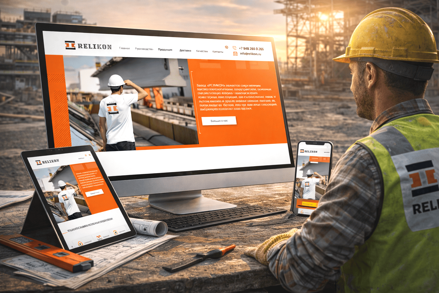На главной странице РЕЛИКОН открывается индустриальный пейзаж без украшений: бетон, арматура, масштаб оборудования, строитель как точка контроля в системе большого производства. Атмосфера строгая, собранная, взрослая — она сразу задает ощущение ответственности и технологической дисциплины. Создание сайта и SEO-продвижение выполнены одной командой — РОСТСАЙТ. Подобное визуальное решение формирует первичное доверие к бренду и повышает готовность к деловому сотрудничеству, поскольку клиент мгновенно считывает уровень компании.