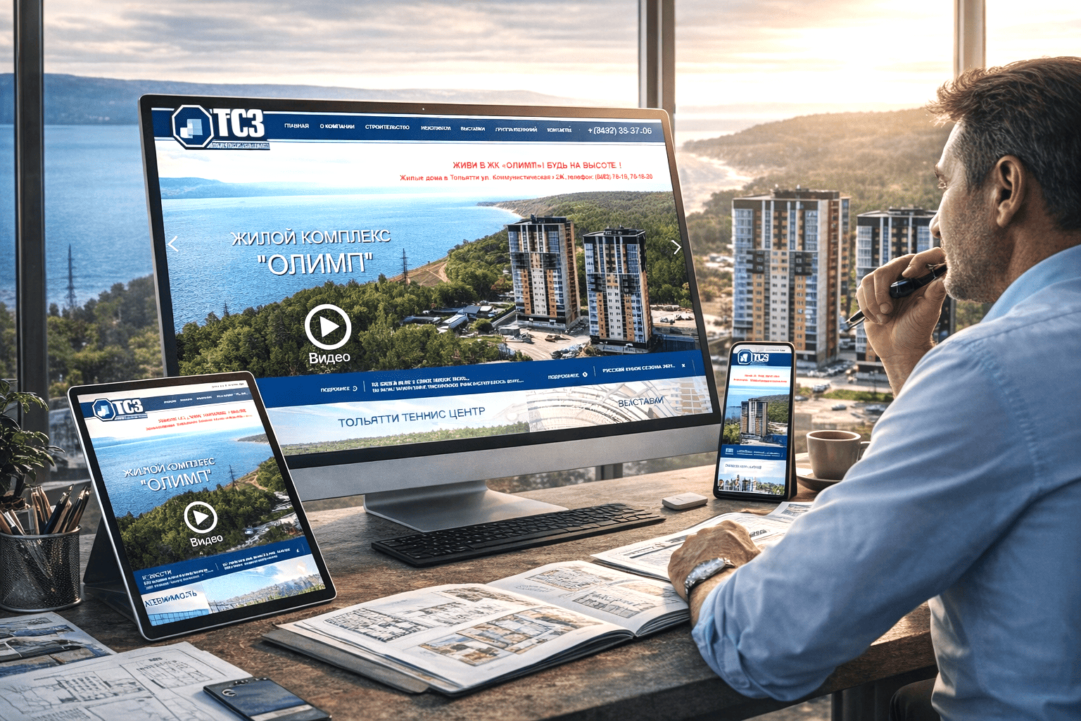 Панорамный взгляд с высоты раскрывает пространство, воздух и уверенность проекта, визуально подчеркивает масштаб застройки, усиливает ощущение надежности и статуса, формирует эмоциональное доверие и мягко подталкивает клиента к решению о покупке и общению с девелопером. Разработка сайта Тольяттистройзаказчик.рф и его раскрутка в Яндексе выполнены веб-студией РОСТСАЙТ.